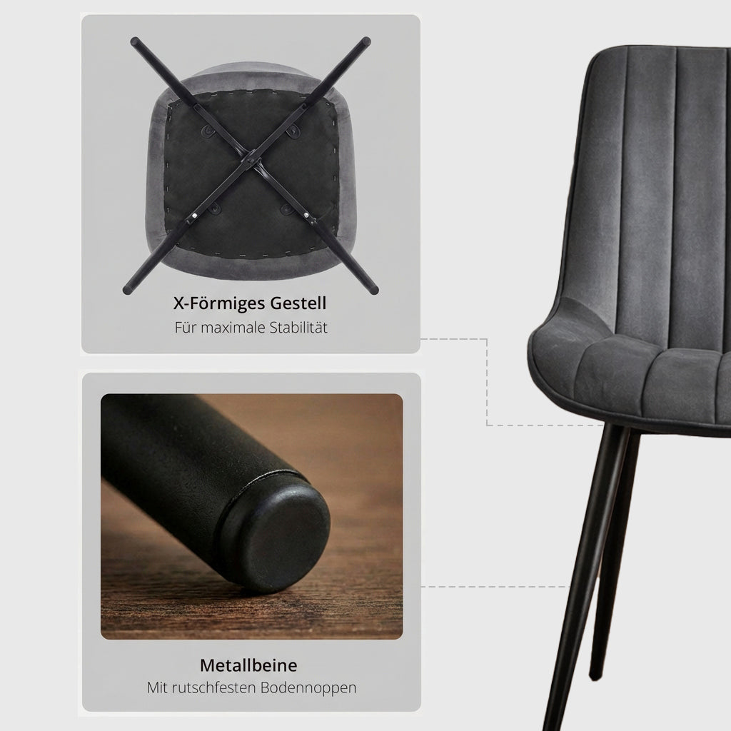 EDLES DESIGN & HOHER SITZKOMFORT: Das 4er Set Esszimmerstühle besticht durch einen weichen, hochwertigen Samtbezug in Grau. Die angenehme Polsterung und die ergonomisch geformte Rückenlehne sorgen auch bei längerem Sitzen für maximalen Komfort – ideal für gemütliche Abendessen oder als bequemer Sessel im Wohnzimmer.