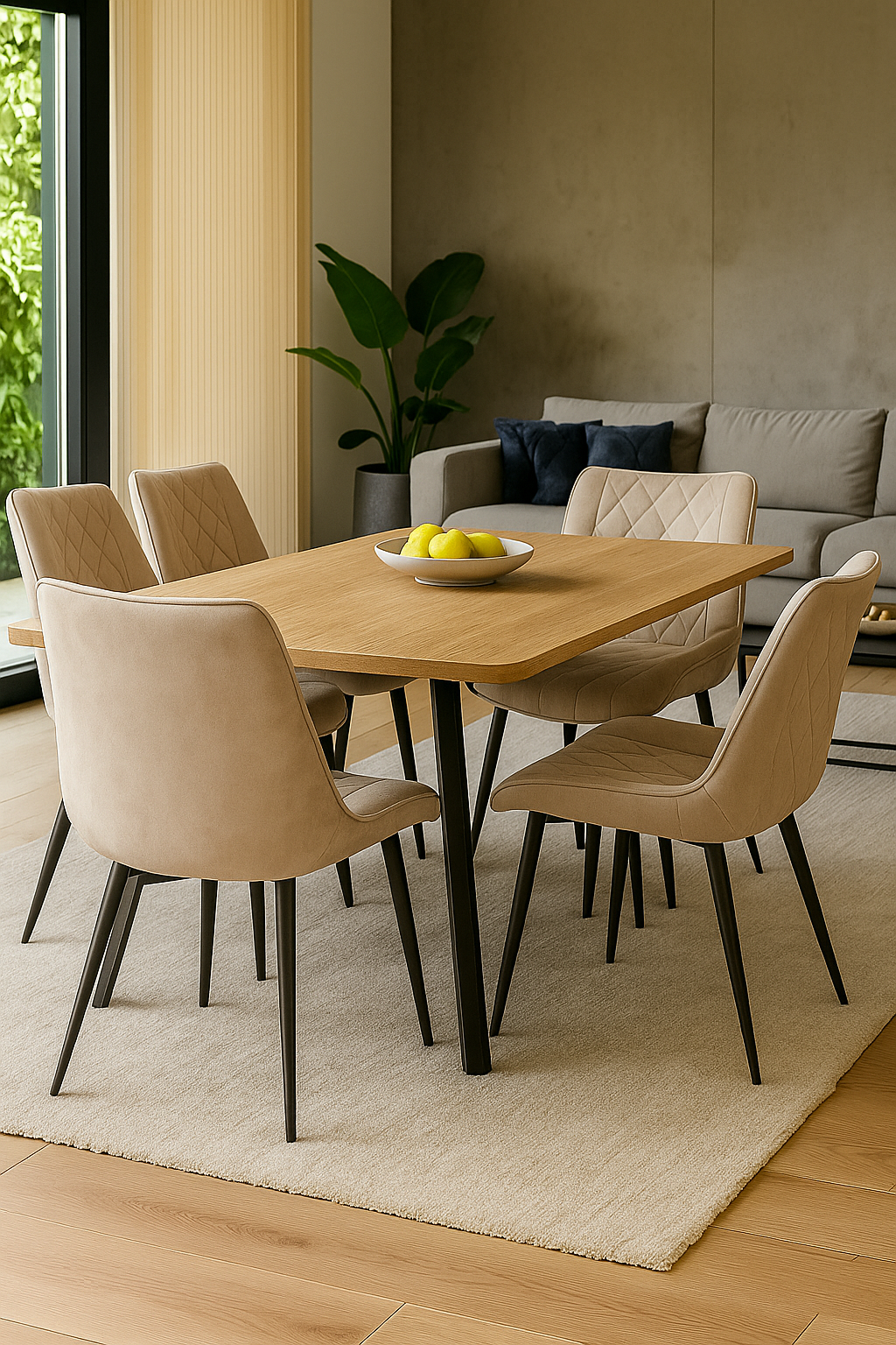 Esszimmerstühle in verschiedenen Farben mit schwarzen Metallbeinen. Die Stühle sind mit Samtstoff bezogen und sehr bequem. Die Stuhlbeine sind aus Stahl.