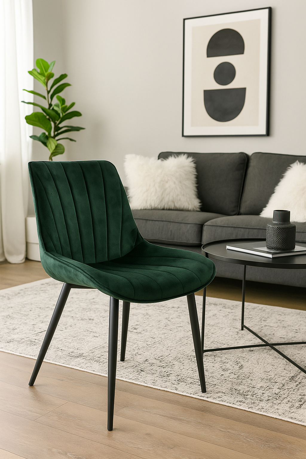 Esszimmerstühle in verschiedenen Farben mit schwarzen Metallbeinen. Die Stühle sind mit Samtstoff bezogen und sehr bequem. Die Stuhlbeine sind aus Stahl.